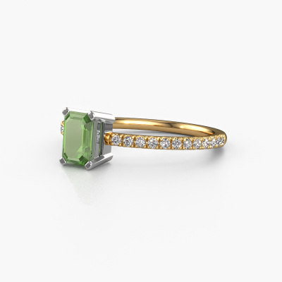 The ring shown above is called the Denita 2 EME. We call this type of ring a pavé solitaire ring because it has one centre gemstone and a band that is also pave set with gemstones. This engagement ring is made in 14 Carat gold set with a 6x4 mm emerald cut tourmaline green, and pave set diamonds at the sides. Each piece of jewellery is made just for you by our master goldsmiths in our own studio.This traditional gold pavé solitaire engagement ring has an exquisite emerald cut tourmaline green centre stone. To further accentuate the centre stone, the band is set full with more diamonds. Its open prong setting allows light to strike the tourmaline green from various angles and this adds sparkle to your tourmaline green ring. The photo shown above depicts the goldsmith's carefully handcrafted details of the ring. The high positioning of the centre stone is truly eye-catching. The perfect engagement ring for the crown jewel of your life!Are you on a budget? Please feel free to contact us, so we can go discuss your options. We offer our engagement rings at guaranteed best price, because we make them to order. You won't find such a price anywhere else!Our team adds new designs to our online collection daily. Our designers and goldsmiths work together in creating the best design. We strive to offer a diverse collection of jewels. Perhaps you have a specific jewel design in mind. One you came across somewhere. Please contact us for a free consultation. We will make you an offer, based on a fair price/ quality ratio, that will baffle you.To make it easier for you, we offer a 30 day return policy. Check our terms and conditions.