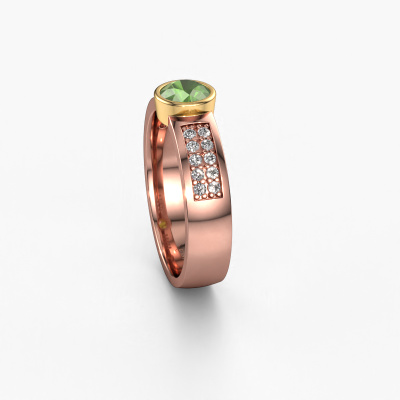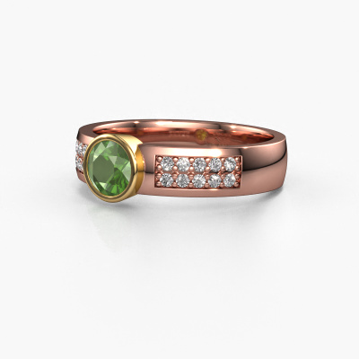 The ring shown above is called the Ise 3. We call this type of ring a pavé solitaire ring because it has one centre gemstone and a band that is also pave set with gemstones. The 14 Carat rose gold engagement ring is set with a round 4.7 mm tourmaline green centre stone and the band is pave set with diamond gemstones. Each jewel is made just for you by our master goldsmiths in our own studio.This modern rose gold pavé solitaire engagement ring has an exquisite round tourmaline green centre stone. To further accentuate the centre stone, the band is fully set with more diamonds. Its open prong setting allows light to strike the tourmaline green from various angles and this adds sparkle to your tourmaline green ring. The photo shown above depicts the goldsmith's carefully handcrafted details of the ring. The high positioning of the centre stone is truly eye-catching. The perfect engagement ring for the crown jewel of your life! Because we design and deliver our own rings, we can offer you a engagement ring at a price you won't find anywhere else. A ring is made to order, which helps prevent excess supplies, so we can make you a great price offer. We understand it feels risky, buying your engagement ring online, but we will gladly assist in the designing process, taking your budget into consideration.Our team adds new designs to our online collection daily. Our designers and goldsmiths work together in creating the best design. We strive to offer a diverse collection of jewels. Perhaps you have a specific jewel design in mind. One you came across somewhere. Please contact us for a free consultation. We will make you an offer, based on a fair price/ quality ratio, that will baffle you.To make it easier for you, we offer a 30 day return policy. Check our terms and conditions.