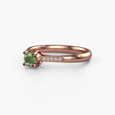 The ring shown above is called the Janna 2. We call this type of ring a pavé solitaire ring because it has one centre gemstone and a band that is also pave set with gemstones. This promise ring is made in 14 Carat rose gold set with a 4 mm round tourmaline green, and pave set diamonds at the sides. Each piece of jewellery is made just for you by our master goldsmiths in our own studio.This classic rose gold pavé solitaire promise ring has an exquisite round tourmaline green centre stone. To further accentuate the centre stone, the band is set full with more diamonds. Its open prong setting allows light to strike the tourmaline green from various angles and this adds sparkle to your tourmaline green ring. The photo shown above depicts the goldsmith's carefully handcrafted details of the ring. The high positioning of the centre stone is truly eye-catching. The perfect promise ring for the crown jewel of your life!By using a combination of the latest modern techniques, combined with ancient crafting, we can make all our promise ring in our own studio. Each jewel is made to order. This is advantageous because we can offer you a price you won't find anywhere else.Do you have a specific ring in mind? One you came across somewhere. Please feel free to tell us your wishes and we will turn your design into a unique promise ring. You can follow the development of your ring design because we use 3D drawings. This gives you a realistic preview of your design. We will gladly send you a non-binding offer, based on a fair price/ quality ratio. It will amaze you.To make it easier for you, we offer a 30 day return policy. Check our terms and conditions.
