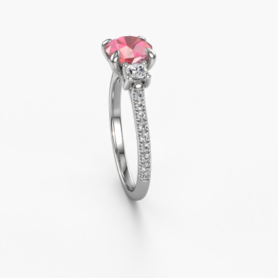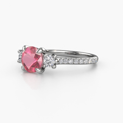 This 14 Carat white gold ring is called Jesica and is set with 6.8 mm tourmaline pink. What is it that makes your relationship unique? What is it about her that makes you want to bend down on one knee? The unique bond between the two of you is emphasized by an equally unique ring. A one of a kind graceful 3-stone engagement ring made especially for her. That is why this classic ring fits her like a glove. Each specific detail of this graceful white gold tourmaline pink set engagement ring is hand-picked, crafted and polished by our expert goldsmith. The result is an exquisite ring, unique and perfectly crafted to perfection. That is what our expert Goldsmiths strive for. This jewel is made just for you, with attention to detail and design.After receiving your order, our goldsmiths will passionately start the creative process of making your engagement ring in our own studio. Because we don't have a big stockpile, these costs will not be passed on to you. Our pricing is proof of that! We offer top quality jewels at lowest price, guaranteed.Different styles of new rings are made daily by our team. Perhaps you have found a 3-stone engagement ring somewhere. One you would like to give to your loved one. Please feel free to share your thoughts and design with our jewel designers. We would love to turn your design into a classic engagement ring. You can follow the development of your ring design because we use very detailed 3D drawings. On top of that, you can order a dummy of the design. A dummy is a plastic ring, which can be shaped according your ring design. You can try it on and check if the engagement ring is up to standard. We will gladly send you a non-binding offer, based on a fair price/ quality ratio. The offer will baffle you, considering the quality of the ring and gemstones.To make it easier for you, we offer a 30 day return policy. Check our terms and conditions.