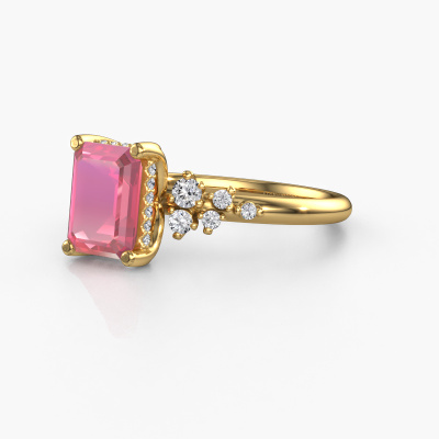 The ring shown above is called the Emma EME. We call this type of ring a pavé solitaire ring because it has one centre gemstone and a band that is also pave set with gemstones. This engagement ring is made in 14 Carat gold set with a 8x6 mm emerald cut tourmaline pink, and pave set lab-grown diamonds at the sides. Each piece of jewellery is made with passion and love by one of our master goldsmiths.This fantasy gold pavé solitaire engagement ring has an exquisite emerald cut tourmaline pink centre stone. To further accentuate the centre stone, the band is set full with more lab-grown diamonds. Its open prong setting allows light to strike the tourmaline pink from various angles and this adds sparkle to your tourmaline pink ring. The photo shown above depicts the goldsmith's carefully handcrafted details of the ring. The high positioning of the centre stone is truly eye-catching. The perfect engagement ring for the crown jewel of your life!After receiving your order, our goldsmiths will passionately start the creative process of making your engagement ring in our own studio. Because we don't have a big stockpile, these costs will not be passed on to you. Our pricing is proof of that! We offer top quality jewels at lowest price, guaranteed.Our team adds new designs to our online collection daily. Our designers and goldsmiths work together in creating the best design. We strive to offer a diverse collection of jewels. Perhaps you have a specific jewel design in mind. One you came across somewhere. Please contact us for a free consultation. We will make you an offer, based on a fair price/ quality ratio, that will baffle you.To make it easier for you, we offer a 30 day return policy. Check our terms and conditions.
