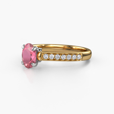 The ring shown above is called the Valorie ovl 2. We call this type of ring a pavé solitaire ring because it has one centre gemstone and a band that is also pave set with gemstones. This engagement ring is made in 14 Carat gold set with a 7x5 mm oval tourmaline pink, and pave set lab-grown diamonds at the sides. Each piece of jewellery is made with passion and love by one of our master goldsmiths.This fashionable gold pavé solitaire engagement ring has an exquisite oval tourmaline pink centre stone. To further accentuate the centre stone, the band is set full with more lab-grown diamonds. Its open prong setting allows light to strike the tourmaline pink from various angles and this adds sparkle to your tourmaline pink ring. The photo shown above depicts the goldsmith's carefully handcrafted details of the ring. The high positioning of the centre stone is truly eye-catching. The perfect engagement ring for the crown jewel of your life!Are you on a budget? Please feel free to contact us, so we can go discuss your options. We offer our engagement rings at guaranteed best price, because we make them to order. You won't find such a price anywhere else!Our team adds new designs to our online collection daily. Our designers and goldsmiths work together in creating the best design. We strive to offer a diverse collection of jewels. Perhaps you have a specific jewel design in mind. One you came across somewhere. Please contact us for a free consultation. We will make you an offer, based on a fair price/ quality ratio, that will baffle you.To make it easier for you, we offer a 30 day return policy. Check our terms and conditions.