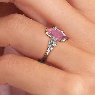 This platinum ring is called Emma MRQ and is set with tourmaline pink. How would you describe the style of the love of your life? Does she have a unique sense of style? This stunning special platinum engagement ring can be custom-made to your own