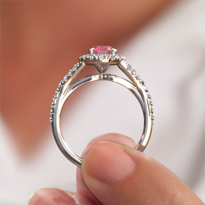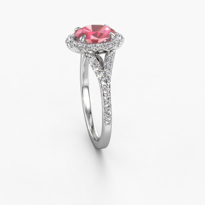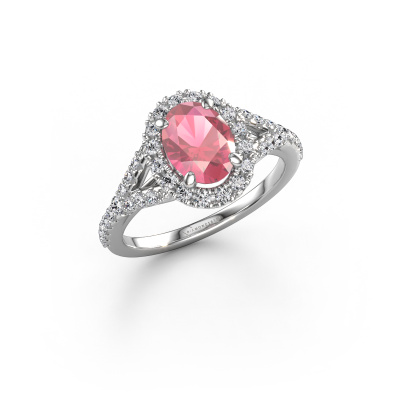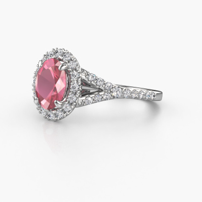 The ring shown above is called the Kimber OVL. We call this type of ring a pavé solitaire ring because it has one centre gemstone and a band that is also pave set with gemstones. The platinum engagement ring is set with a oval 8x6 mm tourmaline pink centre stone and the band is pave set with lab grown diamond gemstones. Each jewel is made with passion and love by one of our master goldsmiths.This exclusive platinum pavé solitaire engagement ring has an exquisite oval tourmaline pink centre stone. To further accentuate the centre stone, the band is fully set with more lab-grown diamonds. Its open prong setting allows light to strike the tourmaline pink from various angles and this adds sparkle to your tourmaline pink ring. The photo shown above depicts the goldsmith's carefully handcrafted details of the ring. The high positioning of the centre stone is truly eye-catching. The perfect engagement ring for the crown jewel of your life! By using a combination of the latest modern techniques, combined with ancient crafting, we can make all our engagement rings in our own studio. Each jewel is made to order. This is advantageous because we can offer you a price you won't find anywhere else.Our team adds new designs to our online collection daily. Our designers and goldsmiths work together in creating the best design. We strive to offer a diverse collection of jewels. Perhaps you have a specific jewel design in mind. One you came across somewhere. Please contact us for a free consultation. We will make you an offer, based on a fair price/ quality ratio, that will baffle you.To make it easier for you, we offer a 30 day return policy. Check our terms and conditions.