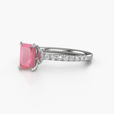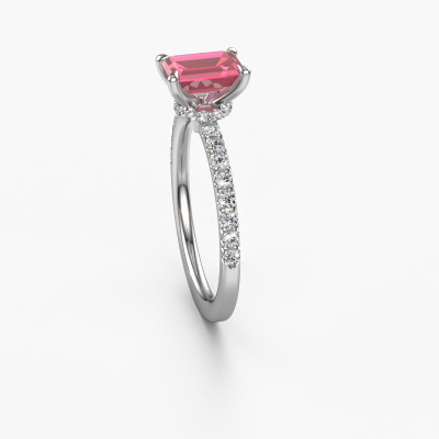 The ring shown above is called the Crystal EME 4. We call this type of ring a pavé solitaire ring because it has one centre gemstone and a band that is also pave set with gemstones. The platinum engagement ring is set with a emerald cut 7x5 mm tourmaline pink centre stone and the band is pave set with lab grown diamond gemstones. Each jewel is created to add sparkle to your finger, each jewel is lovingly made by hand by our goldsmiths.This fashionable platinum pavé solitaire engagement ring has an exquisite emerald cut tourmaline pink centre stone. To further accentuate the centre stone, the band is fully set with more lab-grown diamonds. Its open prong setting allows light to strike the tourmaline pink from various angles and this adds sparkle to your tourmaline pink ring. The photo shown above depicts the goldsmith's carefully handcrafted details of the ring. The high positioning of the centre stone is truly eye-catching. The perfect engagement ring for the crown jewel of your life! After receiving your order, our goldsmiths will passionately start the creative process of making your engagement ring in our own studio. Because we don't have a big stockpile, these costs will not be passed on to you. Our pricing is proof of that! We offer top quality jewels at lowest price, guaranteed.Our team adds new designs to our online collection daily. Our designers and goldsmiths work together in creating the best design. We strive to offer a diverse collection of jewels. Perhaps you have a specific jewel design in mind. One you came across somewhere. Please contact us for a free consultation. We will make you an offer, based on a fair price/ quality ratio, that will baffle you.To make it easier for you, we offer a 30 day return policy. Check our terms and conditions.
