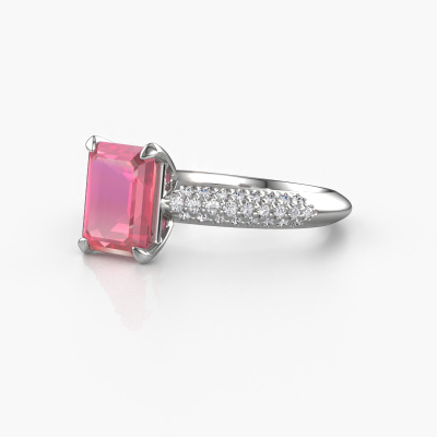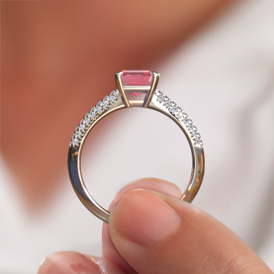 The ring shown above is called the Morane EME. We call this type of ring a pavé solitaire ring because it has one centre gemstone and a band that is also pave set with gemstones. The platinum engagement ring is set with a emerald cut 8x6 mm tourmaline pink centre stone and the band is pave set with lab grown diamond gemstones. Each jewel is made just for you by our master goldsmiths in our own studio.This unique platinum pavé solitaire engagement ring has an exquisite emerald cut tourmaline pink centre stone. To further accentuate the centre stone, the band is fully set with more lab-grown diamonds. Its open prong setting allows light to strike the tourmaline pink from various angles and this adds sparkle to your tourmaline pink ring. The photo shown above depicts the goldsmith's carefully handcrafted details of the ring. The high positioning of the centre stone is truly eye-catching. The perfect engagement ring for the crown jewel of your life! After receiving your order, our goldsmiths will passionately start the creative process of making your engagement ring in our own studio. Because we don't have a big stockpile, these costs will not be passed on to you. Our pricing is proof of that! We offer top quality jewels at lowest price, guaranteed.Our team adds new designs to our online collection daily. Our designers and goldsmiths work together in creating the best design. We strive to offer a diverse collection of jewels. Perhaps you have a specific jewel design in mind. One you came across somewhere. Please contact us for a free consultation. We will make you an offer, based on a fair price/ quality ratio, that will baffle you.To make it easier for you, we offer a 30 day return policy. Check our terms and conditions.