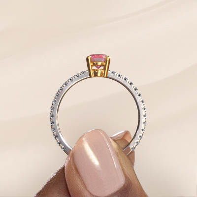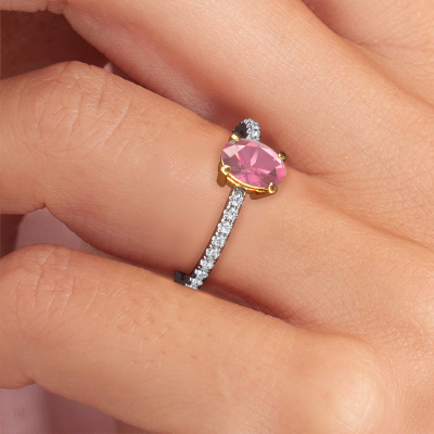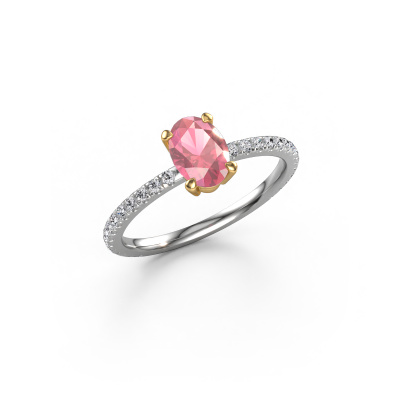 The ring shown above is called the Lynelle 2. We call this type of ring a pavé solitaire ring because it has one centre gemstone and a band that is also pave set with gemstones. This engagement ring is made in 14 Carat white gold set with a 7x5 mm oval tourmaline pink, and pave set diamonds at the sides. Each piece of jewellery is created to add sparkle to your finger, each jewel is lovingly made by hand by our goldsmiths.This classic white gold pavé solitaire engagement ring has an exquisite oval tourmaline pink centre stone. To further accentuate the centre stone, the band is set full with more diamonds. Its open prong setting allows light to strike the tourmaline pink from various angles and this adds sparkle to your tourmaline pink ring. The photo shown above depicts the goldsmith's carefully handcrafted details of the ring. The high positioning of the centre stone is truly eye-catching. The perfect engagement ring for the crown jewel of your life!After receiving your order, our goldsmiths will start the creative process of making your Lynelle 2 engagement ring. We don't keep stock. This is advantageous because these costs will not be passed on to you. Therefore, we can offer jewellery at exceptionally low prices.Do you have a specific ring in mind? One you came across somewhere. Please feel free to tell us your wishes and we will turn your design into a unique engagement ring. You can follow the development of your ring design because we use 3D drawings. This gives you a realistic preview of your design. We will gladly send you a non-binding offer, based on a fair price/ quality ratio. It will amaze you.To make it easier for you, we offer a 30 day return policy. Check our terms and conditions.