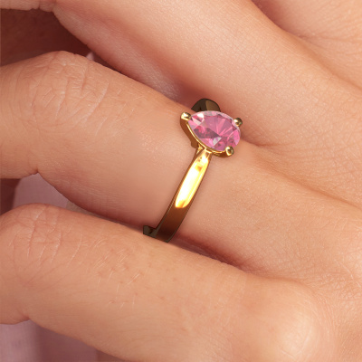 The ring shown above is called the Mignon PER 1, we call this a solitaire ring because it contains a single gemstone. The engagement ring is made in 14 Carat gold and has a pear tourmaline pink of 7x5 mm. The cool thing about our configurator is that you can compile your own piece of jewellery, into a completely personalized one. This solitaire ring is crafted in the precious metals gold with gold, but of course you are free to pick your own colours. Each piece of jewellery is created to add sparkle to your finger, each jewel is lovingly made by hand by our goldsmiths.The solitaire ring is a special type of engagement ring. Its open prong setting allows light to strike the gemstone from various angles. This classic engagement ring is a stunning eye-catcher because of the high positioning of the gemstone. In order for you to commemorate your proposal with a unique ring, we carefully adorn this solitaire ring by hand. The love of your life deserves nothing but the best. After receiving your order, our goldsmiths will start the creative process of making your Mignon PER 1 engagement ring. We don't keep stock. This is advantageous because these costs will not be passed on to you. Therefore, we can offer jewellery at exceptionally low prices.Our team adds new designs to our online collection daily. Our designers and goldsmiths work together in creating the best design. We strive to offer a diverse collection of jewels. Perhaps you have a specific jewel design in mind. One you came across somewhere. Please contact us for a free consultation. We will make you an offer, based on a fair price/ quality ratio, that will baffle you.To make it easier for you, we offer a 30 day return policy. Check our terms and conditions.
