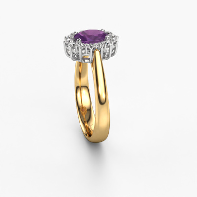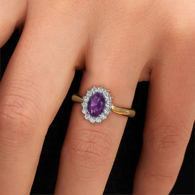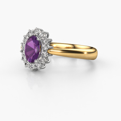 The ring shown above is called the Margien 1. We call this a Lady Diana ring. With an Lady Diana engagement ring, the larger centre gem is encircled by smaller side stones. This 14 Carat gold ring is set with a 7x5 mm oval amethyst gemstone, surrounded by smaller diamonds side stones. It's the most famous and celebrated engagement ring in the world; The Lady Diana ring. Exclusively meant for the most remarkable person in your life! A truly stunning aspect of this Lady Diana ring is its centre amethyst. The smaller side stones embracing the amethyst emphasize the sparkle of the centre gemstone, this makes it look as though they merge into one big gemstone. Due to its design, this is even more apparent in the Lady Di ring. Our expert Goldsmiths are keen to create a unique ring just for you. We can even customize the ring to your liking in our own crafting studio. This piece of jewellery is made just for you by our master goldsmiths in our own studio.After receiving your order, our goldsmiths will start the creative process of making your Margien 1 engagement ring. We don't keep stock. This is advantageous because these costs will not be passed on to you. Therefore, we can offer jewellery at exceptionally low prices.Our designers and goldsmiths work together each day, creating new jewels. Perhaps you have found a nice traditional engagement ring somewhere, which can be used to customize your unique ring. Please feel free to contact us. We will make you an offer, based on a fair price/ quality ratio, which will amaze you.To make it easier for you, we offer a 30 day return policy. Check our terms and conditions.