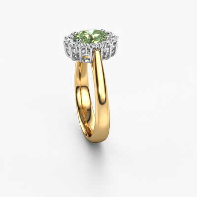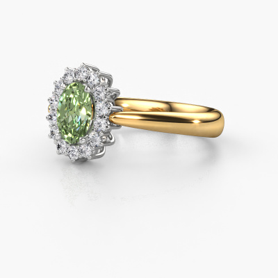 The ring shown above is called the Margien 1. We call this a Lady Diana ring. With an Lady Diana engagement ring, the larger centre gem is encircled by smaller side stones. This 14 Carat gold ring is set with a 7x5 mm oval green lab grown diamond gemstone, surrounded by smaller diamonds side stones. It's the most famous and celebrated engagement ring in the world; The Lady Diana ring. Exclusively meant for the most remarkable person in your life! A truly stunning aspect of this Lady Diana ring is its centre green lab grown diamond. The smaller side stones embracing the green lab grown diamond emphasize the sparkle of the centre gemstone, this makes it look as though they merge into one big gemstone. Due to its design, this is even more apparent in the Lady Di ring. Our expert Goldsmiths are keen to create a unique ring just for you. We can even customize the ring to your liking in our own crafting studio. This piece of jewellery is made just for you by our master goldsmiths in our own studio.After receiving your order, our goldsmiths will start the creative process of making your Margien 1 engagement ring. We don't keep stock. This is advantageous because these costs will not be passed on to you. Therefore, we can offer jewellery at exceptionally low prices.Our designers and goldsmiths work together each day, creating new jewels. Perhaps you have found a nice traditional engagement ring somewhere, which can be used to customize your unique ring. Please feel free to contact us. We will make you an offer, based on a fair price/ quality ratio, which will amaze you.To make it easier for you, we offer a 30 day return policy. Check our terms and conditions.