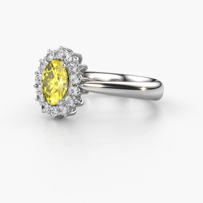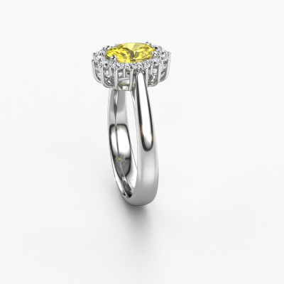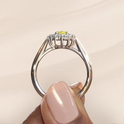 The ring shown above is called the Margien 1. We call this a Lady Diana ring. With an Lady Diana engagement ring, the larger centre gem is encircled by smaller side stones. This 14 Carat white gold ring is set with a 7x5 mm oval yellow lab grown diamond gemstone, surrounded by smaller diamonds side stones. It's the most famous and celebrated engagement ring in the world; The Lady Diana ring. Exclusively meant for the most remarkable person in your life! A truly stunning aspect of this Lady Diana ring is its centre yellow lab grown diamond. The smaller side stones embracing the yellow lab grown diamond emphasize the sparkle of the centre gemstone, this makes it look as though they merge into one big gemstone. Due to its design, this is even more apparent in the Lady Di ring. Our expert Goldsmiths are keen to create a unique ring just for you. We can even customize the ring to your liking in our own crafting studio. This piece of jewellery is made just for you by our master goldsmiths in our own studio.After receiving your order, our goldsmiths will start the creative process of making your Margien 1 engagement ring. We don't keep stock. This is advantageous because these costs will not be passed on to you. Therefore, we can offer jewellery at exceptionally low prices.Our designers and goldsmiths work together each day, creating new jewels. Perhaps you have found a nice traditional engagement ring somewhere, which can be used to customize your unique ring. Please feel free to contact us. We will make you an offer, based on a fair price/ quality ratio, which will amaze you.To make it easier for you, we offer a 30 day return policy. Check our terms and conditions.