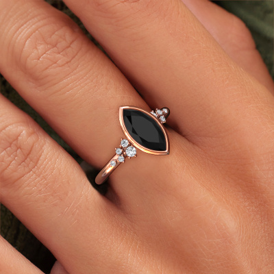 This 14 Carat rose gold ring is called Aliyah MRQ and is set with 1.633 crt black diamond. Are you looking for a trendy rose gold engagement ring which you can customize to your own liking? This trendy engagement ring is set with black diamond which is carefully selected for this specific ring in order to create the best effect. Our expert goldsmith will create your ring in our own crafting studio, where the black diamond will be set with great care. The ring will then be polished till it shines perfectly. Nothing but the best for the love of your life! The great thing about our online tool is, that you can compile your own jewellery into a unique, personalized piece. Each piece of jewellery is made by a team of passionate goldsmiths and jewel designers. This will make your crown jewel truly eye-catching.By using our modern techniques, we can design and customize the finest quality jewels with the utmost care for you. Our engagement rings are always priced 30 percent lower than other jewellers. We make engagement rings to order so we don't have to maintain a large stock. If you have a certain budget, we are more than happy to advice you accordingly.Our designers and goldsmiths work together each day, creating new jewels. Perhaps you have found a nice trendy engagement ring somewhere, which can be used to customize your unique ring. Please feel free to contact us. We will make you an offer, based on a fair price/ quality ratio, which will amaze you.To make it easier for you, we offer a 30 day return policy. Check our terms and conditions.