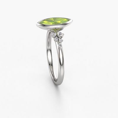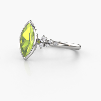 This 14 Carat white gold ring is called Aliyah MRQ and is set with 11x5.5 mm peridot. Are you looking for a trendy white gold engagement ring which you can customize to your own liking? This trendy engagement ring is set with peridot which is carefully selected for this specific ring in order to create the best effect. Our expert goldsmith will create your ring in our own crafting studio, where the peridot will be set with great care. The ring will then be polished till it shines perfectly. Nothing but the best for the love of your life! The great thing about our online tool is, that you can compile your own jewellery into a unique, personalized piece. Each piece of jewellery is made by a team of passionate goldsmiths and jewel designers. This will make your crown jewel truly eye-catching.By using our modern techniques, we can design and customize the finest quality jewels with the utmost care for you. Our engagement rings are always priced 30 percent lower than other jewellers. We make engagement rings to order so we don't have to maintain a large stock. If you have a certain budget, we are more than happy to advice you accordingly.Our designers and goldsmiths work together each day, creating new jewels. Perhaps you have found a nice trendy engagement ring somewhere, which can be used to customize your unique ring. Please feel free to contact us. We will make you an offer, based on a fair price/ quality ratio, which will amaze you.To make it easier for you, we offer a 30 day return policy. Check our terms and conditions.