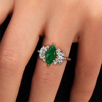 This 14 Carat gold ring is called Jaimie and is set with 12x6 mm emerald. Are you looking for a unique gold engagement ring which you can customize to your own liking? This unique engagement ring is set with emerald which is carefully selected for this specific ring in order to create the best effect. Our expert goldsmith will create your ring in our own crafting studio, where the emerald will be set with great care. The ring will then be polished till it shines perfectly. Nothing but the best for the love of your life! The great thing about our online tool is, that you can compile your own jewellery into a unique, personalized piece. Each piece of jewellery is made just for you by our master goldsmiths in our own studio.By using a combination of the latest modern techniques, combined with ancient crafting, we can make all our engagement rings in our own studio. Each jewel is made to order. This is advantageous because we can offer you a price you won't find anywhere else.Have you found a specific engagement ring somewhere which you would like to give to your loved one? Please feel free to express your wishes to our jewel designers because we would be honoured to turn your design into a unique engagement ring. You can follow the development of your ring design because we use 3D drawings. This gives you a realistic preview of how your design will look. You can also preorder a dummy. A dummy is a plastic ring, which can be shaped according your ring design. You can try it on and check if its width and size are suitable for you. We will gladly send you a non-binding offer, based on a fair price/ quality ratio. It will amaze you, considering the quality of the ring and gemstones.To make it easier for you, we offer a 30 day return policy. Check our terms and conditions.