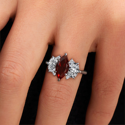 This platinum ring is called Jaimie and is set with 12x6 mm garnet. Are you looking for a unique platinum engagement ring which you can customize to your own liking? This unique engagement ring is set with garnet which is carefully selected for this specific ring in order to create the best effect. Our expert goldsmith will create your ring in our own crafting studio, where the garnet will be set with great care. The ring will then be polished till it shines perfectly. Nothing but the best for the love of your life! The great thing about our online tool is, that you can compile your own jewellery into a unique, personalized piece. Each piece of jewellery is made just for you by our master goldsmiths in our own studio.By using a combination of the latest modern techniques, combined with ancient crafting, we can make all our engagement rings in our own studio. Each jewel is made to order. This is advantageous because we can offer you a price you won't find anywhere else.Have you found a specific engagement ring somewhere which you would like to give to your loved one? Please feel free to express your wishes to our jewel designers because we would be honoured to turn your design into a unique engagement ring. You can follow the development of your ring design because we use 3D drawings. This gives you a realistic preview of how your design will look. You can also preorder a dummy. A dummy is a plastic ring, which can be shaped according your ring design. You can try it on and check if its width and size are suitable for you. We will gladly send you a non-binding offer, based on a fair price/ quality ratio. It will amaze you, considering the quality of the ring and gemstones.To make it easier for you, we offer a 30 day return policy. Check our terms and conditions.