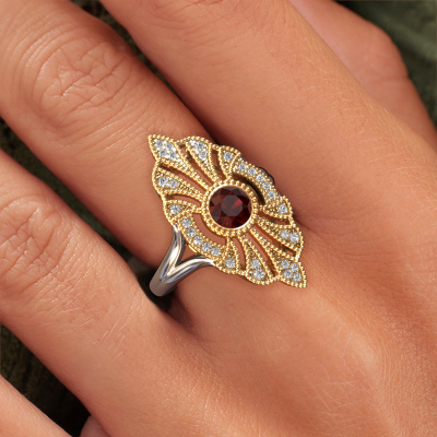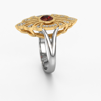 This 14 Carat white gold ring is called Hanna and is set with 5 mm garnet. This filigree white gold engagement ring is a true work of art! A beautifully adorned design of intricate wires. With dedication, patience and the utmost precision, our expert goldsmith will design a ring just for you. The adornment of small wiring is crafted to perfection by hand. It's a lengthy process which includes welding, crafting and polishing until our Goldsmiths are completely satisfied with the result: a perfect eye-catching ring that makes her shine with delight. Therefore the vintage filigree engagement ring is an extraordinary gift to bestow upon the love of your life. A handmade one-of-a-kind personalized ring, to be given to that special someone on that special moment when you pop the question. Isn't that wonderful? This piece of jewellery is created to add sparkle to your finger, each jewel is lovingly made by hand by our goldsmiths.After receiving your order, our goldsmiths will passionately start the creative process of making your engagement ring in our own studio. Because we don't have a big stockpile, these costs will not be passed on to you. Our pricing is proof of that! We offer top quality jewels at lowest price, guaranteed.Our team adds new designs to our online collection daily. Our designers and goldsmiths work together in creating the best design. We strive to offer a diverse collection of jewels. Perhaps you have a specific jewel design in mind. One you came across somewhere. Please contact us for a free consultation. We will make you an offer, based on a fair price/ quality ratio, that will baffle you.To make it easier for you, we offer a 30 day return policy. Check our terms and conditions.