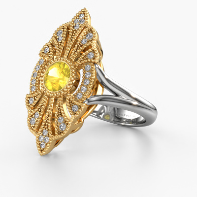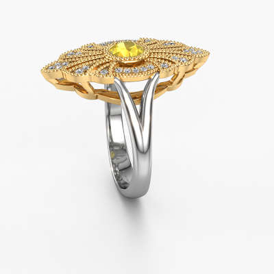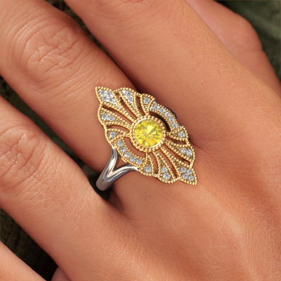 This 14 Carat white gold ring is called Hanna and is set with 5 mm yellow sapphire. This filigree white gold engagement ring is a true work of art! A beautifully adorned design of intricate wires. With dedication, patience and the utmost precision, our expert goldsmith will design a ring just for you. The adornment of small wiring is crafted to perfection by hand. It's a lengthy process which includes welding, crafting and polishing until our Goldsmiths are completely satisfied with the result: a perfect eye-catching ring that makes her shine with delight. Therefore the vintage filigree engagement ring is an extraordinary gift to bestow upon the love of your life. A handmade one-of-a-kind personalized ring, to be given to that special someone on that special moment when you pop the question. Isn't that wonderful? This piece of jewellery is created to add sparkle to your finger, each jewel is lovingly made by hand by our goldsmiths.After receiving your order, our goldsmiths will passionately start the creative process of making your engagement ring in our own studio. Because we don't have a big stockpile, these costs will not be passed on to you. Our pricing is proof of that! We offer top quality jewels at lowest price, guaranteed.Our team adds new designs to our online collection daily. Our designers and goldsmiths work together in creating the best design. We strive to offer a diverse collection of jewels. Perhaps you have a specific jewel design in mind. One you came across somewhere. Please contact us for a free consultation. We will make you an offer, based on a fair price/ quality ratio, that will baffle you.To make it easier for you, we offer a 30 day return policy. Check our terms and conditions.
