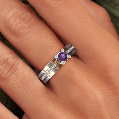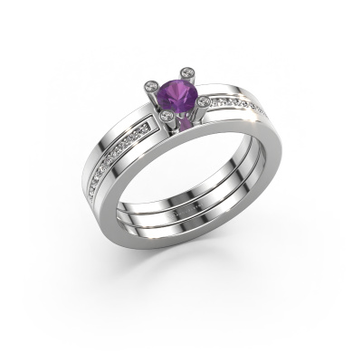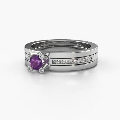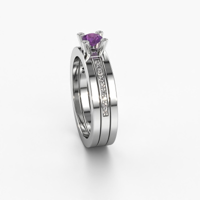 The ring shown above is called the Alisha. We call this type of ring a pavé solitaire ring because it has one centre gemstone and a band that is also pave set with gemstones. The 14 Carat white gold engagement ring is set with a round 4 mm amethyst centre stone and the band is pave set with diamond gemstones. Each jewel is unique in every way! Simply customize to your liking,This design white gold pavé solitaire engagement ring has an exquisite round amethyst centre stone. To further accentuate the centre stone, the band is fully set with more diamonds. Its open prong setting allows light to strike the amethyst from various angles and this adds sparkle to your amethyst ring. The photo shown above depicts the goldsmith's carefully handcrafted details of the ring. The high positioning of the centre stone is truly eye-catching. The perfect engagement ring for the crown jewel of your life! By using a combination of the latest modern techniques, combined with ancient crafting, we can make all our engagement rings in our own studio. Each jewel is made to order. This is advantageous because we can offer you a price you won't find anywhere else.Have you found a specific engagement ring somewhere which you would like to give to your loved one? Please feel free to express your wishes to our jewel designers because we would be honoured to turn your design into a design engagement ring. You can follow the development of your ring design because we use 3D drawings. This gives you a realistic preview of how your design will look. You can also preorder a dummy. A dummy is a plastic ring, which can be shaped according your ring design. You can try it on and check if its width and size are suitable for you. We will gladly send you a non-binding offer, based on a fair price/ quality ratio. It will amaze you, considering the quality of the ring and gemstones.To make it easier for you, we offer a 30 day return policy. Check our terms and conditions.