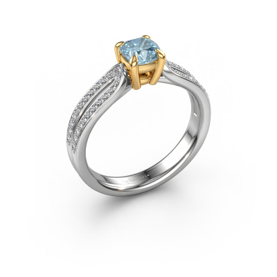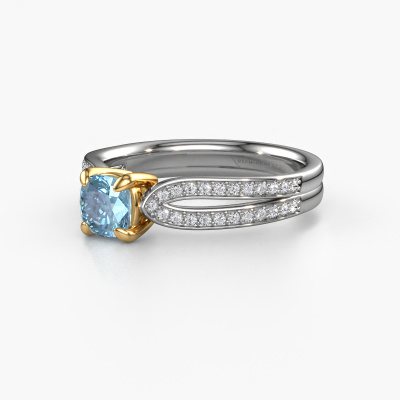 The ring shown above is called the Antonia cus 2. We call this type of ring a pavé solitaire ring because it has one centre gemstone and a band that is also pave set with gemstones. The 14 Carat white gold engagement ring is set with a cushion 5 mm blue lab grown diamond centre stone and the band is pave set with lab grown diamond gemstones. Each jewel is made just for you by our master goldsmiths in our own studio.This fantasy white gold pavé solitaire engagement ring has an exquisite cushion blue lab grown diamond centre stone. To further accentuate the centre stone, the band is fully set with more lab-grown diamonds. Its open prong setting allows light to strike the blue lab grown diamond from various angles and this adds sparkle to your blue lab grown diamond ring. The photo shown above depicts the goldsmith's carefully handcrafted details of the ring. The high positioning of the centre stone is truly eye-catching. The perfect engagement ring for the crown jewel of your life! By using our modern techniques, we can design and customize the finest quality jewels with the utmost care for you. Our engagement rings are always priced 30 percent lower than other jewellers. We make engagement rings to order so we don't have to maintain a large stock. If you have a certain budget, we are more than happy to advice you accordingly.Have you found a specific engagement ring somewhere which you would like to give to your loved one? Please feel free to express your wishes to our jewel designers because we would be honoured to turn your design into a fantasy engagement ring. You can follow the development of your ring design because we use 3D drawings. This gives you a realistic preview of how your design will look. You can also preorder a dummy. A dummy is a plastic ring, which can be shaped according your ring design. You can try it on and check if its width and size are suitable for you. We will gladly send you a non-binding offer, based on a fair price/ quality ratio. It will amaze you, considering the quality of the ring and gemstones.To make it easier for you, we offer a 30 day return policy. Check our terms and conditions.