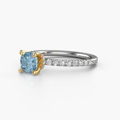 The ring shown above is called the Crystal CUS 4. We call this type of ring a pavé solitaire ring because it has one centre gemstone and a band that is also pave set with gemstones. The 14 Carat white gold engagement ring is set with a cushion 5.5 mm blue lab grown diamond centre stone and the band is pave set with diamond gemstones. Each jewel is created to add sparkle to your finger, each jewel is lovingly made by hand by our goldsmiths.This chic white gold pavé solitaire engagement ring has an exquisite cushion blue lab grown diamond centre stone. To further accentuate the centre stone, the band is fully set with more diamonds. Its open prong setting allows light to strike the blue lab grown diamond from various angles and this adds sparkle to your blue lab grown diamond ring. The photo shown above depicts the goldsmith's carefully handcrafted details of the ring. The high positioning of the centre stone is truly eye-catching. The perfect engagement ring for the crown jewel of your life! By using our modern techniques, we can design and customize the finest quality jewels with the utmost care for you. Our engagement rings are always priced 30 percent lower than other jewellers. We make engagement rings to order so we don't have to maintain a large stock. If you have a certain budget, we are more than happy to advice you accordingly.Do you have a specific ring in mind? One you came across somewhere. Please feel free to tell us your wishes and we will turn your design into a unique engagement ring. You can follow the development of your ring design because we use 3D drawings. This gives you a realistic preview of your design. We will gladly send you a non-binding offer, based on a fair price/ quality ratio. It will amaze you.To make it easier for you, we offer a 30 day return policy. Check our terms and conditions.