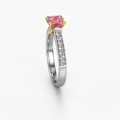 The ring shown above is called the Valorie cus 2. We call this type of ring a pavé solitaire ring because it has one centre gemstone and a band that is also pave set with gemstones. The 14 Carat white gold engagement ring is set with a cushion 5.5 mm tourmaline pink centre stone and the band is pave set with diamond gemstones. Each jewel is made just for you by our master goldsmiths in our own studio.This traditional white gold pavé solitaire engagement ring has an exquisite cushion tourmaline pink centre stone. To further accentuate the centre stone, the band is fully set with more diamonds. Its open prong setting allows light to strike the tourmaline pink from various angles and this adds sparkle to your tourmaline pink ring. The photo shown above depicts the goldsmith's carefully handcrafted details of the ring. The high positioning of the centre stone is truly eye-catching. The perfect engagement ring for the crown jewel of your life! By using a combination of the latest modern techniques, combined with ancient crafting, we can make all our engagement rings in our own studio. Each jewel is made to order. This is advantageous because we can offer you a price you won't find anywhere else.Our designers and goldsmiths work together each day, creating new jewels. Perhaps you have found a nice traditional engagement ring somewhere, which can be used to customize your unique ring. Please feel free to contact us. We will make you an offer, based on a fair price/ quality ratio, which will amaze you.To make it easier for you, we offer a 30 day return policy. Check our terms and conditions.