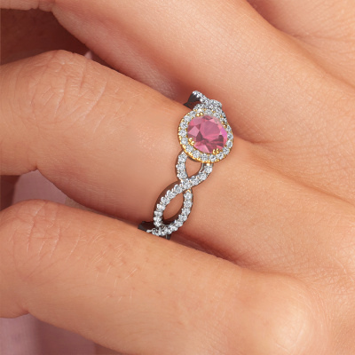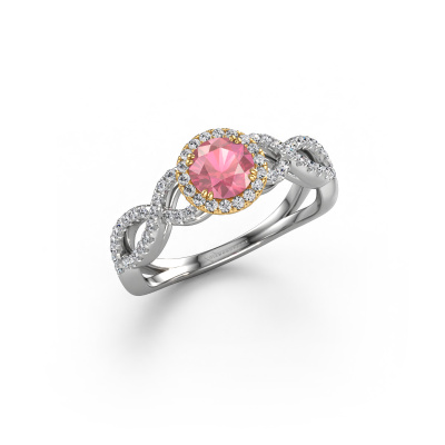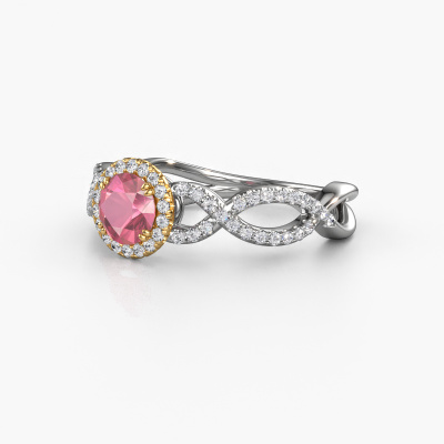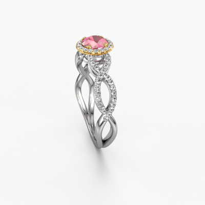 The ring shown above is called the Dionne rnd. We call this type of ring a pavé solitaire ring because it has one centre gemstone and a band that is also pave set with gemstones. The 14 Carat white gold engagement ring is set with a round 5 mm tourmaline pink centre stone and the band is pave set with diamond gemstones. Each jewel is made just for you by our master goldsmiths in our own studio.This classic white gold pavé solitaire engagement ring has an exquisite round tourmaline pink centre stone. To further accentuate the centre stone, the band is fully set with more diamonds. Its open prong setting allows light to strike the tourmaline pink from various angles and this adds sparkle to your tourmaline pink ring. The photo shown above depicts the goldsmith's carefully handcrafted details of the ring. The high positioning of the centre stone is truly eye-catching. The perfect engagement ring for the crown jewel of your life! Because we design and deliver our own rings, we can offer you a engagement ring at a price you won't find anywhere else. A ring is made to order, which helps prevent excess supplies, so we can make you a great price offer. We understand it feels risky, buying your engagement ring online, but we will gladly assist in the designing process, taking your budget into consideration.Do you have a specific ring in mind? One you came across somewhere. Please feel free to tell us your wishes and we will turn your design into a unique engagement ring. You can follow the development of your ring design because we use 3D drawings. This gives you a realistic preview of your design. We will gladly send you a non-binding offer, based on a fair price/ quality ratio. It will amaze you.To make it easier for you, we offer a 30 day return policy. Check our terms and conditions.