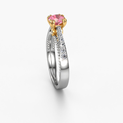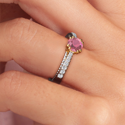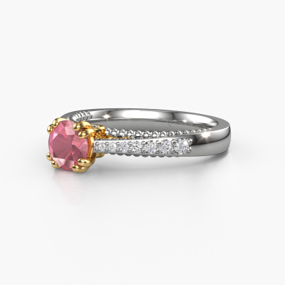 The ring shown above is called the Rozella. We call this type of ring a pavé solitaire ring because it has one centre gemstone and a band that is also pave set with gemstones. The 14 Carat white gold engagement ring is set with a round 5.5 mm tourmaline pink centre stone and the band is pave set with lab grown diamond gemstones. Each jewel is made to shine bright around your finger. Each jewel is hand made with love by our goldsmiths.This unique white gold pavé solitaire engagement ring has an exquisite round tourmaline pink centre stone. To further accentuate the centre stone, the band is fully set with more lab-grown diamonds. Its open prong setting allows light to strike the tourmaline pink from various angles and this adds sparkle to your tourmaline pink ring. The photo shown above depicts the goldsmith's carefully handcrafted details of the ring. The high positioning of the centre stone is truly eye-catching. The perfect engagement ring for the crown jewel of your life! After receiving your order, our goldsmiths will start the creative process of making your Rozella engagement ring. We don't keep stock. This is advantageous because these costs will not be passed on to you. Therefore, we can offer jewellery at exceptionally low prices.Our designers and goldsmiths work together each day, creating new jewels. Perhaps you have found a nice unique engagement ring somewhere, which can be used to customize your unique ring. Please feel free to contact us. We will make you an offer, based on a fair price/ quality ratio, which will amaze you.To make it easier for you, we offer a 30 day return policy. Check our terms and conditions.