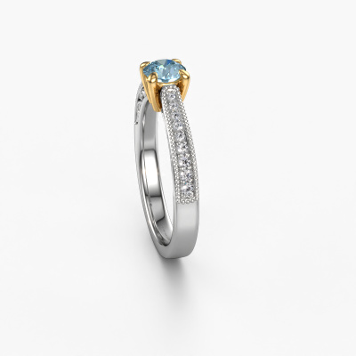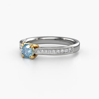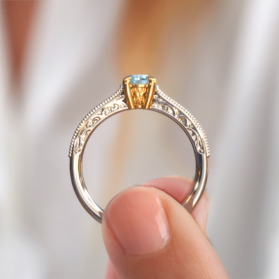 This 14 Carat white gold ring is called Shonta RND and is set with 4.7 mm blue lab grown diamond. This filigree white gold engagement ring is a true work of art! A beautifully adorned design of intricate wires. With dedication, patience and the utmost precision, our expert goldsmith will design a ring just for you. The adornment of small wiring is crafted to perfection by hand. It's a lengthy process which includes welding, crafting and polishing until our Goldsmiths are completely satisfied with the result: a perfect eye-catching ring that makes her shine with delight. Therefore the vintage filigree engagement ring is an extraordinary gift to bestow upon the love of your life. A handmade one-of-a-kind personalized ring, to be given to that special someone on that special moment when you pop the question. Isn't that wonderful? This piece of jewellery is made just for you by our master goldsmiths in our own studio.