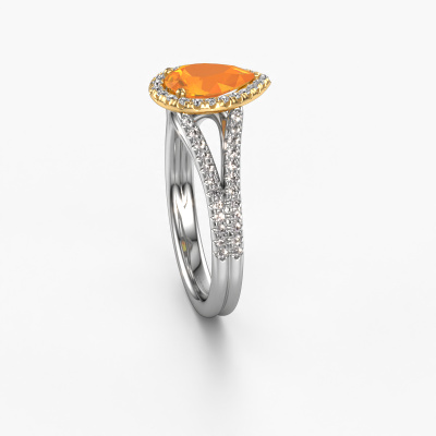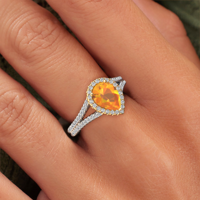 The ring shown above is called the Verla pear 2. We call this type of ring a halo ring because it has one centre gemstone and a band that is also pave set with gemstones. The 14 Carat white gold engagement ring is set with a pear 8x6 mm citrin centre stone and the band is pave set with diamonds. What makes this exclusive white gold halo ring special are the smaller sized stones embracing the centre stone. This gorgeous engagement ring is called a halo ring because the smaller gemstones give the centre stone a halo of surrounding light. In order for the smaller stones to enhance the centre stone, they have to be placed so there is no interference of light. And that's when our expert goldsmiths come in. Each individual stone is carefully set in the ring by hand. During manufacturing, light fall is constantly monitored to make sure the special halo is still visible. In the end you get a unique engagement ring, with a citrin of your choosing at its centre. You can imagine the effect of a ring of such significance when you give it to her on her special day to shine. After receiving your order, our goldsmiths will passionately start the creative process of making your engagement ring in our own studio. Because we don't have a big stockpile, these costs will not be passed on to you. Our pricing is proof of that! We offer top quality jewels at lowest price, guaranteed.Our designers and goldsmiths work together each day, creating new jewels. Perhaps you have found a nice exclusive engagement ring somewhere, which can be used to customize your unique ring. Please feel free to contact us. We will make you an offer, based on a fair price/ quality ratio, which will amaze you.To make it easier for you, we offer a 30 day return policy. Check our terms and conditions.