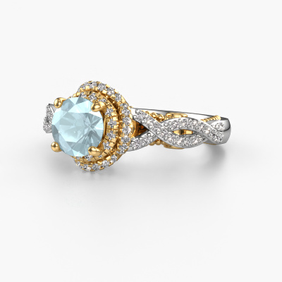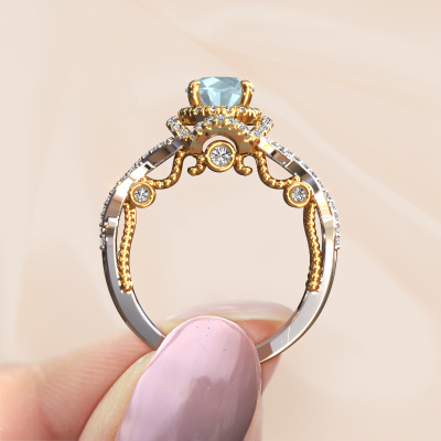 The ring shown above is called the Leora. We call this type of ring a halo ring because it has one centre gemstone and a band that is also pave set with gemstones. The 14 Carat white gold engagement ring is set with a round 6.5 mm aquamarine centre stone and the band is pave set with lab-grown diamonds. What makes this vintage white gold halo ring special are the smaller sized stones embracing the centre stone. This gorgeous engagement ring is called a halo ring because the smaller gemstones give the centre stone a halo of surrounding light. In order for the smaller stones to enhance the centre stone, they have to be placed so there is no interference of light. And that's when our expert goldsmiths come in. Each individual stone is carefully set in the ring by hand. During manufacturing, light fall is constantly monitored to make sure the special halo is still visible. In the end you get a unique engagement ring, with a aquamarine of your choosing at its centre. You can imagine the effect of a ring of such significance when you give it to her on her special day to shine. By using our modern techniques, we can design and customize the finest quality jewels with the utmost care for you. Our engagement rings are always priced 30 percent lower than other jewellers. We make engagement rings to order so we don't have to maintain a large stock. If you have a certain budget, we are more than happy to advice you accordingly.Our designers and goldsmiths work together each day, creating new jewels. Perhaps you have found a nice vintage engagement ring somewhere, which can be used to customize your unique ring. Please feel free to contact us. We will make you an offer, based on a fair price/ quality ratio, which will amaze you.To make it easier for you, we offer a 30 day return policy. Check our terms and conditions.
