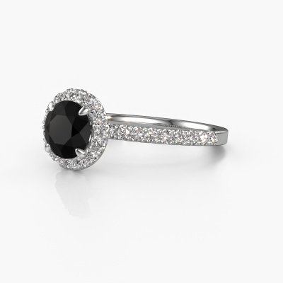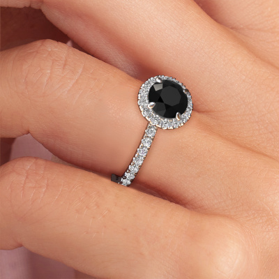 The ring shown above is called the Miranda rnd. We call this type of ring a halo ring because it has one centre gemstone and a band that is also pave set with gemstones. The 14 Carat white gold engagement ring is set with a round 1.30 crt black diamond centre stone and the band is pave set with lab-grown diamonds. What makes this exclusive white gold halo ring special are the smaller sized stones embracing the centre stone. This gorgeous engagement ring is called a halo ring because the smaller gemstones give the centre stone a halo of surrounding light. In order for the smaller stones to enhance the centre stone, they have to be placed so there is no interference of light. And that's when our expert goldsmiths come in. Each individual stone is carefully set in the ring by hand. During manufacturing, light fall is constantly monitored to make sure the special halo is still visible. In the end you get a unique engagement ring, with a black diamond of your choosing at its centre. You can imagine the effect of a ring of such significance when you give it to her on her special day to shine. By using our modern techniques, we can design and customize the finest quality jewels with the utmost care for you. Our engagement rings are always priced 30 percent lower than other jewellers. We make engagement rings to order so we don't have to maintain a large stock. If you have a certain budget, we are more than happy to advice you accordingly.Have you found a specific engagement ring somewhere which you would like to give to your loved one? Please feel free to express your wishes to our jewel designers because we would be honoured to turn your design into a exclusive engagement ring. You can follow the development of your ring design because we use 3D drawings. This gives you a realistic preview of how your design will look. You can also preorder a dummy. A dummy is a plastic ring, which can be shaped according your ring design. You can try it on and check if its width and size are suitable for you. We will gladly send you a non-binding offer, based on a fair price/ quality ratio. It will amaze you, considering the quality of the ring and gemstones.To make it easier for you, we offer a 30 day return policy. Check our terms and conditions.