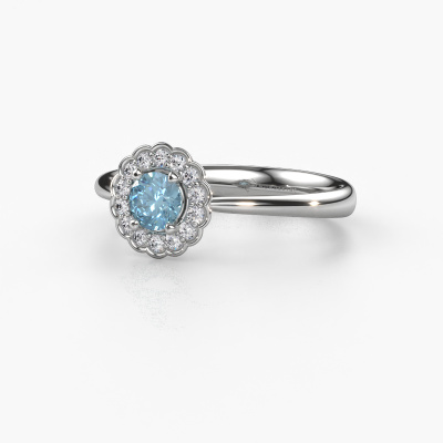 The ring shown above is called the Debi. We call this type of ring a halo ring because it has one centre gemstone and a band that is also pave set with gemstones. The 14 Carat white gold engagement ring is set with a round 4.2 mm blue lab grown diamond centre stone and the band is pave set with diamonds. What makes this classic white gold halo ring special are the smaller sized stones embracing the centre stone. This gorgeous engagement ring is called a halo ring because the smaller gemstones give the centre stone a halo of surrounding light. In order for the smaller stones to enhance the centre stone, they have to be placed so there is no interference of light. And that's when our expert goldsmiths come in. Each individual stone is carefully set in the ring by hand. During manufacturing, light fall is constantly monitored to make sure the special halo is still visible. In the end you get a unique engagement ring, with a blue lab grown diamond of your choosing at its centre. You can imagine the effect of a ring of such significance when you give it to her on her special day to shine.