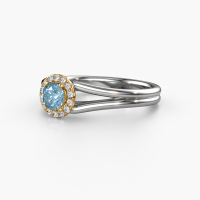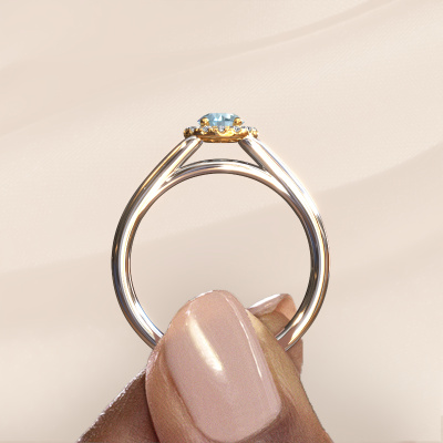 The ring shown above is called the Verla rnd 1. We call this type of ring a halo ring because it has one centre gemstone and a band that is also pave set with gemstones. The 14 Carat white gold engagement ring is set with a round 4.7 mm blue lab grown diamond centre stone and the band is pave set with diamonds. What makes this classic white gold halo ring special are the smaller sized stones embracing the centre stone. This gorgeous engagement ring is called a halo ring because the smaller gemstones give the centre stone a halo of surrounding light. In order for the smaller stones to enhance the centre stone, they have to be placed so there is no interference of light. And that's when our expert goldsmiths come in. Each individual stone is carefully set in the ring by hand. During manufacturing, light fall is constantly monitored to make sure the special halo is still visible. In the end you get a unique engagement ring, with a blue lab grown diamond of your choosing at its centre. You can imagine the effect of a ring of such significance when you give it to her on her special day to shine.