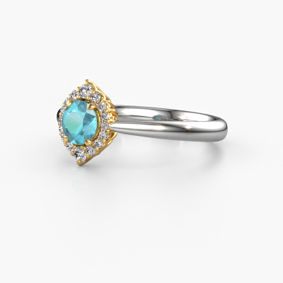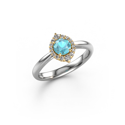 The ring shown above is called the Tora. We call this type of ring a cluster ring, the centre gemstone is surrounded by smaller sized stones. This 14 Carat white gold version is set with a 5 mm round blue topaz centre stone, embraced by smaller lab-grown diamonds. The classic white gold cluster engagement ring stands out because of its shape. Together, the smaller and bigger sized blue topaz gemstones form a flower and they appear to collide into one big sparkling gem. This classic engagement ring is also known as the flower ring. Our expert Goldsmiths make sure the smaller lab-grown diamonds stones are set identically so there is no light interference in the blue topaz but unity instead. With perfect precision and a skilful hand each blue topaz is set in the ring. During manufacturing, it is constantly monitored to make sure light reflects flawlessly. This results in a unique engagement ring, with a radiant blue topaz at its centre. A lovely, meaningful gift to bestow upon the love of your life. By using a combination of the latest modern techniques, combined with ancient crafting, we can make all our engagement rings in our own studio. Each jewel is made to order. This is advantageous because we can offer you a price you won't find anywhere else.Have you found a specific engagement ring somewhere which you would like to give to your loved one? Please feel free to express your wishes to our jewel designers because we would be honoured to turn your design into a classic engagement ring. You can follow the development of your ring design because we use 3D drawings. This gives you a realistic preview of how your design will look. You can also preorder a dummy. A dummy is a plastic ring, which can be shaped according your ring design. You can try it on and check if its width and size are suitable for you. We will gladly send you a non-binding offer, based on a fair price/ quality ratio. It will amaze you, considering the quality of the ring and gemstones.To make it easier for you, we offer a 30 day return policy. Check our terms and conditions.