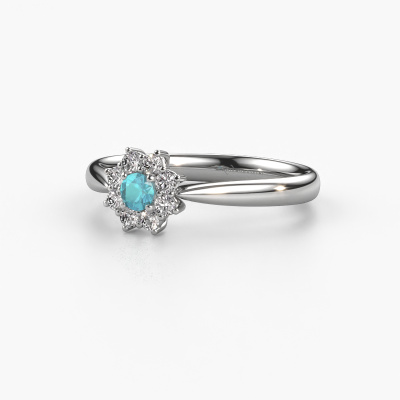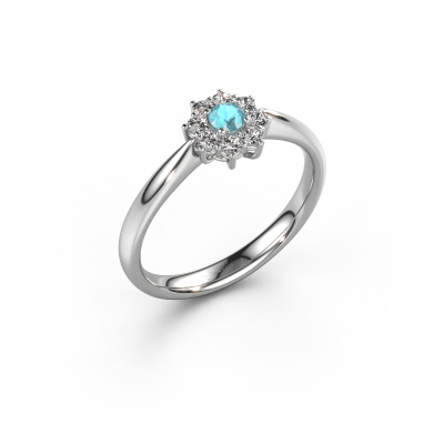 The ring shown above is called the Carolyn 1. We call this type of ring a cluster ring, the centre gemstone is surrounded by smaller sized stones. This 14 Carat white gold version is set with a 3 mm round blue topaz centre stone, embraced by smaller diamonds. The traditional white gold cluster engagement ring stands out because of its shape. Together, the smaller and bigger sized blue topaz gemstones form a flower and they appear to collide into one big sparkling gem. This traditional engagement ring is also known as the flower ring. Our expert Goldsmiths make sure the smaller diamonds stones are set identically so there is no light interference in the blue topaz but unity instead. With perfect precision and a skilful hand each blue topaz is set in the ring. During manufacturing, it is constantly monitored to make sure light reflects flawlessly. This results in a unique engagement ring, with a radiant blue topaz at its centre. A lovely, meaningful gift to bestow upon the love of your life. By using our modern techniques, we can design and customize the finest quality jewels with the utmost care for you. Our engagement rings are always priced 30 percent lower than other jewellers. We make engagement rings to order so we don't have to maintain a large stock. If you have a certain budget, we are more than happy to advice you accordingly.Do you have a specific ring in mind? One you came across somewhere. Please feel free to tell us your wishes and we will turn your design into a unique engagement ring. You can follow the development of your ring design because we use 3D drawings. This gives you a realistic preview of your design. We will gladly send you a non-binding offer, based on a fair price/ quality ratio. It will amaze you.To make it easier for you, we offer a 30 day return policy. Check our terms and conditions.