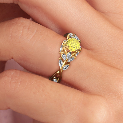 The ring shown above is called the Samantha RND. We call this type of ring a pavé solitaire ring because it has one centre gemstone and a band that is also pave set with gemstones. This engagement ring is made in 14 Carat gold set with a 5 mm round yellow lab grown diamond, and pave set diamonds at the sides. Each piece of jewellery is made with passion and love by one of our master goldsmiths.This contemporary gold pavé solitaire engagement ring has an exquisite round yellow lab grown diamond centre stone. To further accentuate the centre stone, the band is set full with more diamonds. Its open prong setting allows light to strike the yellow lab grown diamond from various angles and this adds sparkle to your yellow lab grown diamond ring. The photo shown above depicts the goldsmith's carefully handcrafted details of the ring. The high positioning of the centre stone is truly eye-catching. The perfect engagement ring for the crown jewel of your life!By using a combination of the latest modern techniques, combined with ancient crafting, we can make all our engagement rings in our own studio. Each jewel is made to order. This is advantageous because we can offer you a price you won't find anywhere else.Our designers and goldsmiths work together each day, creating new jewels. Perhaps you have found a nice contemporary engagement ring somewhere, which can be used to customize your unique ring. Please feel free to contact us. We will make you an offer, based on a fair price/ quality ratio, which will amaze you.To make it easier for you, we offer a 30 day return policy. Check our terms and conditions.