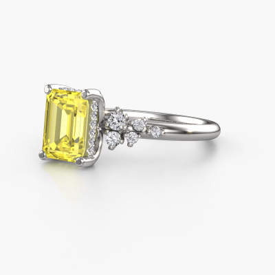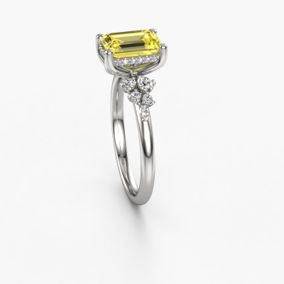 The ring shown above is called the Emma EME. We call this type of ring a pavé solitaire ring because it has one centre gemstone and a band that is also pave set with gemstones. This engagement ring is made in platinum set with a 8x6 mm emerald cut yellow lab grown diamond, and pave set lab-grown diamonds at the sides. Each piece of jewellery is made with passion and love by one of our master goldsmiths.This fantasy platinum pavé solitaire engagement ring has an exquisite emerald cut yellow lab grown diamond centre stone. To further accentuate the centre stone, the band is set full with more lab-grown diamonds. Its open prong setting allows light to strike the yellow lab grown diamond from various angles and this adds sparkle to your yellow lab grown diamond ring. The photo shown above depicts the goldsmith's carefully handcrafted details of the ring. The high positioning of the centre stone is truly eye-catching. The perfect engagement ring for the crown jewel of your life!After receiving your order, our goldsmiths will passionately start the creative process of making your engagement ring in our own studio. Because we don't have a big stockpile, these costs will not be passed on to you. Our pricing is proof of that! We offer top quality jewels at lowest price, guaranteed.Our team adds new designs to our online collection daily. Our designers and goldsmiths work together in creating the best design. We strive to offer a diverse collection of jewels. Perhaps you have a specific jewel design in mind. One you came across somewhere. Please contact us for a free consultation. We will make you an offer, based on a fair price/ quality ratio, that will baffle you.To make it easier for you, we offer a 30 day return policy. Check our terms and conditions.