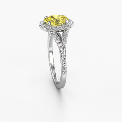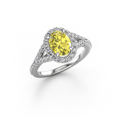 The ring shown above is called the Kimber OVL. We call this type of ring a pavé solitaire ring because it has one centre gemstone and a band that is also pave set with gemstones. The platinum engagement ring is set with a oval 8x6 mm yellow lab grown diamond centre stone and the band is pave set with lab grown diamond gemstones. Each jewel is made with passion and love by one of our master goldsmiths.This exclusive platinum pavé solitaire engagement ring has an exquisite oval yellow lab grown diamond centre stone. To further accentuate the centre stone, the band is fully set with more lab-grown diamonds. Its open prong setting allows light to strike the yellow lab grown diamond from various angles and this adds sparkle to your yellow lab grown diamond ring. The photo shown above depicts the goldsmith's carefully handcrafted details of the ring. The high positioning of the centre stone is truly eye-catching. The perfect engagement ring for the crown jewel of your life! By using a combination of the latest modern techniques, combined with ancient crafting, we can make all our engagement rings in our own studio. Each jewel is made to order. This is advantageous because we can offer you a price you won't find anywhere else.Our team adds new designs to our online collection daily. Our designers and goldsmiths work together in creating the best design. We strive to offer a diverse collection of jewels. Perhaps you have a specific jewel design in mind. One you came across somewhere. Please contact us for a free consultation. We will make you an offer, based on a fair price/ quality ratio, that will baffle you.To make it easier for you, we offer a 30 day return policy. Check our terms and conditions.