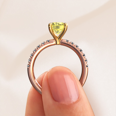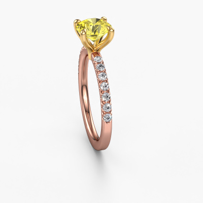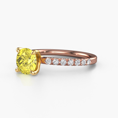 The ring shown above is called the Crystal RND 2. We call this type of ring a pavé solitaire ring because it has one centre gemstone and a band that is also pave set with gemstones. The 14 Carat rose gold engagement ring is set with a round 7 mm yellow lab grown diamond centre stone and the band is pave set with lab grown diamond gemstones. Each jewel is unique in every way! Simply customize to your liking,This classic rose gold pavé solitaire engagement ring has an exquisite round yellow lab grown diamond centre stone. To further accentuate the centre stone, the band is fully set with more lab-grown diamonds. Its open prong setting allows light to strike the yellow lab grown diamond from various angles and this adds sparkle to your yellow lab grown diamond ring. The photo shown above depicts the goldsmith's carefully handcrafted details of the ring. The high positioning of the centre stone is truly eye-catching. The perfect engagement ring for the crown jewel of your life! After receiving your order, our goldsmiths will start the creative process of making your Crystal RND 2 engagement ring. We don't keep stock. This is advantageous because these costs will not be passed on to you. Therefore, we can offer jewellery at exceptionally low prices.Different styles of new rings are made daily by our team. Perhaps you have found a pavé solitaire engagement ring somewhere. One you would like to give to your loved one. Please feel free to share your thoughts and design with our jewel designers. We would love to turn your design into a classic engagement ring. You can follow the development of your ring design because we use very detailed 3D drawings. On top of that, you can order a dummy of the design. A dummy is a plastic ring, which can be shaped according your ring design. You can try it on and check if the engagement ring is up to standard. We will gladly send you a non-binding offer, based on a fair price/ quality ratio. The offer will baffle you, considering the quality of the ring and gemstones.To make it easier for you, we offer a 30 day return policy. Check our terms and conditions.