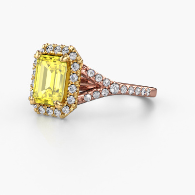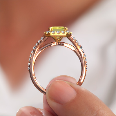 The ring shown above is called the Kimber EME. We call this type of ring a pavé solitaire ring because it has one centre gemstone and a band that is also pave set with gemstones. The 14 Carat rose gold engagement ring is set with a emerald cut 8x6 mm yellow lab grown diamond centre stone and the band is pave set with lab grown diamond gemstones. Each jewel is made by a team of passionate goldsmiths and jewel designers. This will make your crown jewel truly eye-catching.This exclusive rose gold pavé solitaire engagement ring has an exquisite emerald cut yellow lab grown diamond centre stone. To further accentuate the centre stone, the band is fully set with more lab-grown diamonds. Its open prong setting allows light to strike the yellow lab grown diamond from various angles and this adds sparkle to your yellow lab grown diamond ring. The photo shown above depicts the goldsmith's carefully handcrafted details of the ring. The high positioning of the centre stone is truly eye-catching. The perfect engagement ring for the crown jewel of your life! By using a combination of the latest modern techniques, combined with ancient crafting, we can make all our engagement rings in our own studio. Each jewel is made to order. This is advantageous because we can offer you a price you won't find anywhere else.Our team adds new designs to our online collection daily. Our designers and goldsmiths work together in creating the best design. We strive to offer a diverse collection of jewels. Perhaps you have a specific jewel design in mind. One you came across somewhere. Please contact us for a free consultation. We will make you an offer, based on a fair price/ quality ratio, that will baffle you.To make it easier for you, we offer a 30 day return policy. Check our terms and conditions.