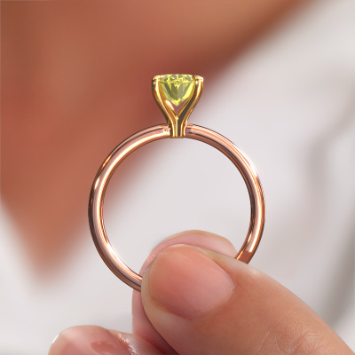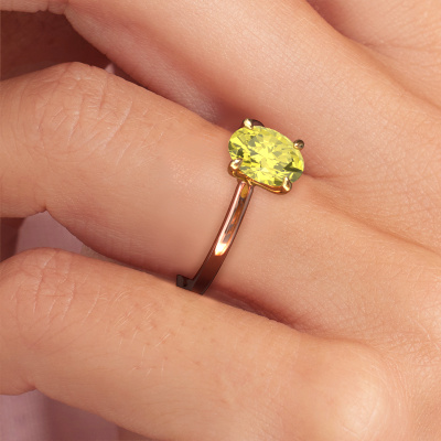 The ring shown above is called the Crystal OVL 1, we call this a solitaire ring because it contains a single gemstone. The engagement ring is made in 14 Carat rose gold and has a oval yellow lab grown diamond of 8x6 mm. The cool thing about our configurator is that you can compile your own piece of jewellery, into a completely personalized one. This solitaire ring is crafted in the precious metals rose gold with gold, but of course you are free to pick your own colours. Each piece of jewellery is created to add sparkle to your finger, each jewel is lovingly made by hand by our goldsmiths.The solitaire ring is a special type of engagement ring. Its open prong setting allows light to strike the gemstone from various angles. This classic engagement ring is a stunning eye-catcher because of the high positioning of the gemstone. In order for you to commemorate your proposal with a unique ring, we carefully adorn this solitaire ring by hand. The love of your life deserves nothing but the best. Because we design and deliver our own rings, we can offer you a engagement ring at a price you won't find anywhere else. A ring is made to order, which helps prevent excess supplies, so we can make you a great price offer. We understand it feels risky, buying your engagement ring online, but we will gladly assist in the designing process, taking your budget into consideration.Our team adds new designs to our online collection daily. Our designers and goldsmiths work together in creating the best design. We strive to offer a diverse collection of jewels. Perhaps you have a specific jewel design in mind. One you came across somewhere. Please contact us for a free consultation. We will make you an offer, based on a fair price/ quality ratio, that will baffle you.To make it easier for you, we offer a 30 day return policy. Check our terms and conditions.