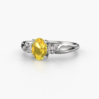 This platinum ring is called Amie OVL and is set with 7x5 mm yellow sapphire. What is it that makes your relationship unique? What is it about her that makes you want to bend down on one knee? The unique bond between the two of you is emphasized by an equally unique ring. A one of a kind stylish 3-stone engagement ring made especially for her. That is why this fantasy ring fits her like a glove. Each specific detail of this stylish platinum yellow sapphire set engagement ring is hand-picked, crafted and polished by our expert goldsmith. The result is an exquisite ring, unique and perfectly crafted to perfection. That is what our expert Goldsmiths strive for. This jewel is made to shine bright around your finger. Each jewel is hand made with love by our goldsmiths.By using our modern techniques, we can design and customize the finest quality jewels with the utmost care for you. Our engagement rings are always priced 30 percent lower than other jewellers. We make engagement rings to order so we don't have to maintain a large stock. If you have a certain budget, we are more than happy to advice you accordingly.Do you have a specific ring in mind? One you came across somewhere. Please feel free to tell us your wishes and we will turn your design into a unique engagement ring. You can follow the development of your ring design because we use 3D drawings. This gives you a realistic preview of your design. We will gladly send you a non-binding offer, based on a fair price/ quality ratio. It will amaze you.To make it easier for you, we offer a 30 day return policy. Check our terms and conditions.