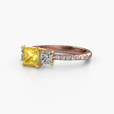 This 14 Carat rose gold ring is called Dorla and is set with 5 mm yellow sapphire. What is it that makes your relationship unique? What is it about her that makes you want to bend down on one knee? The unique bond between the two of you is emphasized by an equally unique ring. A one of a kind micro pave 3-stone engagement ring made especially for her. That is why this exclusive ring fits her like a glove. Each specific detail of this micro pave rose gold yellow sapphire set engagement ring is hand-picked, crafted and polished by our expert goldsmith. The result is an exquisite ring, unique and perfectly crafted to perfection. That is what our expert Goldsmiths strive for. This jewel is unique in every way! Simply customize to your liking,After receiving your order, our goldsmiths will passionately start the creative process of making your engagement ring in our own studio. Because we don't have a big stockpile, these costs will not be passed on to you. Our pricing is proof of that! We offer top quality jewels at lowest price, guaranteed.Do you have a specific ring in mind? One you came across somewhere. Please feel free to tell us your wishes and we will turn your design into a unique engagement ring. You can follow the development of your ring design because we use 3D drawings. This gives you a realistic preview of your design. We will gladly send you a non-binding offer, based on a fair price/ quality ratio. It will amaze you.To make it easier for you, we offer a 30 day return policy. Check our terms and conditions.