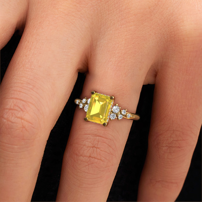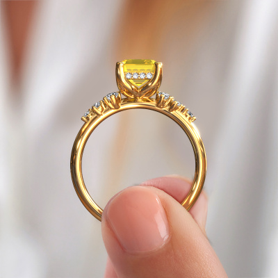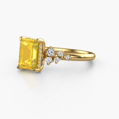 The ring shown above is called the Emma EME. We call this type of ring a pavé solitaire ring because it has one centre gemstone and a band that is also pave set with gemstones. This engagement ring is made in 14 Carat gold set with a 8x6 mm emerald cut yellow sapphire, and pave set lab-grown diamonds at the sides. Each piece of jewellery is made with passion and love by one of our master goldsmiths.This fantasy gold pavé solitaire engagement ring has an exquisite emerald cut yellow sapphire centre stone. To further accentuate the centre stone, the band is set full with more lab-grown diamonds. Its open prong setting allows light to strike the yellow sapphire from various angles and this adds sparkle to your yellow sapphire ring. The photo shown above depicts the goldsmith's carefully handcrafted details of the ring. The high positioning of the centre stone is truly eye-catching. The perfect engagement ring for the crown jewel of your life!After receiving your order, our goldsmiths will passionately start the creative process of making your engagement ring in our own studio. Because we don't have a big stockpile, these costs will not be passed on to you. Our pricing is proof of that! We offer top quality jewels at lowest price, guaranteed.Our team adds new designs to our online collection daily. Our designers and goldsmiths work together in creating the best design. We strive to offer a diverse collection of jewels. Perhaps you have a specific jewel design in mind. One you came across somewhere. Please contact us for a free consultation. We will make you an offer, based on a fair price/ quality ratio, that will baffle you.To make it easier for you, we offer a 30 day return policy. Check our terms and conditions.