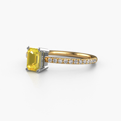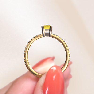 The ring shown above is called the Denita 2 EME. We call this type of ring a pavé solitaire ring because it has one centre gemstone and a band that is also pave set with gemstones. This engagement ring is made in 14 Carat gold set with a 6x4 mm emerald cut yellow sapphire, and pave set diamonds at the sides. Each piece of jewellery is made just for you by our master goldsmiths in our own studio.This traditional gold pavé solitaire engagement ring has an exquisite emerald cut yellow sapphire centre stone. To further accentuate the centre stone, the band is set full with more diamonds. Its open prong setting allows light to strike the yellow sapphire from various angles and this adds sparkle to your yellow sapphire ring. The photo shown above depicts the goldsmith's carefully handcrafted details of the ring. The high positioning of the centre stone is truly eye-catching. The perfect engagement ring for the crown jewel of your life!Are you on a budget? Please feel free to contact us, so we can go discuss your options. We offer our engagement rings at guaranteed best price, because we make them to order. You won't find such a price anywhere else!Our team adds new designs to our online collection daily. Our designers and goldsmiths work together in creating the best design. We strive to offer a diverse collection of jewels. Perhaps you have a specific jewel design in mind. One you came across somewhere. Please contact us for a free consultation. We will make you an offer, based on a fair price/ quality ratio, that will baffle you.To make it easier for you, we offer a 30 day return policy. Check our terms and conditions.
