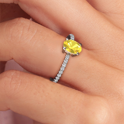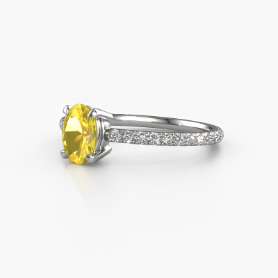 The ring shown above is called the Lynelle 2. We call this type of ring a pavé solitaire ring because it has one centre gemstone and a band that is also pave set with gemstones. This engagement ring is made in platinum set with a 7x5 mm oval yellow sapphire, and pave set diamonds at the sides. Each piece of jewellery is created to add sparkle to your finger, each jewel is lovingly made by hand by our goldsmiths.This classic platinum pavé solitaire engagement ring has an exquisite oval yellow sapphire centre stone. To further accentuate the centre stone, the band is set full with more diamonds. Its open prong setting allows light to strike the yellow sapphire from various angles and this adds sparkle to your yellow sapphire ring. The photo shown above depicts the goldsmith's carefully handcrafted details of the ring. The high positioning of the centre stone is truly eye-catching. The perfect engagement ring for the crown jewel of your life!After receiving your order, our goldsmiths will start the creative process of making your Lynelle 2 engagement ring. We don't keep stock. This is advantageous because these costs will not be passed on to you. Therefore, we can offer jewellery at exceptionally low prices.Do you have a specific ring in mind? One you came across somewhere. Please feel free to tell us your wishes and we will turn your design into a unique engagement ring. You can follow the development of your ring design because we use 3D drawings. This gives you a realistic preview of your design. We will gladly send you a non-binding offer, based on a fair price/ quality ratio. It will amaze you.To make it easier for you, we offer a 30 day return policy. Check our terms and conditions.