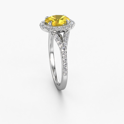 The ring shown above is called the Kimber OVL. We call this type of ring a pavé solitaire ring because it has one centre gemstone and a band that is also pave set with gemstones. The platinum engagement ring is set with a oval 8x6 mm yellow sapphire centre stone and the band is pave set with lab grown diamond gemstones. Each jewel is made with passion and love by one of our master goldsmiths.This exclusive platinum pavé solitaire engagement ring has an exquisite oval yellow sapphire centre stone. To further accentuate the centre stone, the band is fully set with more lab-grown diamonds. Its open prong setting allows light to strike the yellow sapphire from various angles and this adds sparkle to your yellow sapphire ring. The photo shown above depicts the goldsmith's carefully handcrafted details of the ring. The high positioning of the centre stone is truly eye-catching. The perfect engagement ring for the crown jewel of your life! By using a combination of the latest modern techniques, combined with ancient crafting, we can make all our engagement rings in our own studio. Each jewel is made to order. This is advantageous because we can offer you a price you won't find anywhere else.Our team adds new designs to our online collection daily. Our designers and goldsmiths work together in creating the best design. We strive to offer a diverse collection of jewels. Perhaps you have a specific jewel design in mind. One you came across somewhere. Please contact us for a free consultation. We will make you an offer, based on a fair price/ quality ratio, that will baffle you.To make it easier for you, we offer a 30 day return policy. Check our terms and conditions.