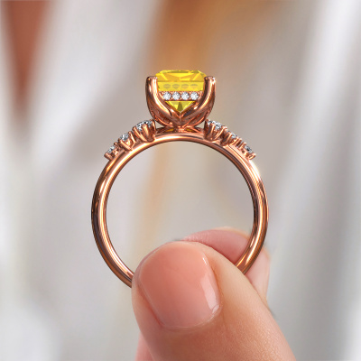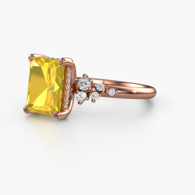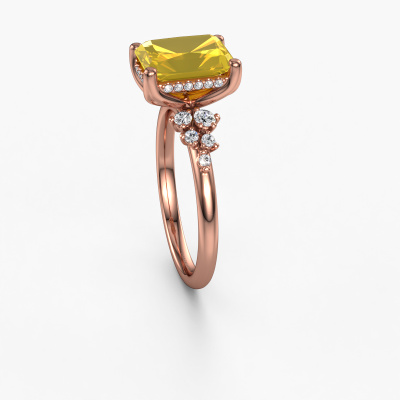 This 14 Carat rose gold ring is called Emma RAD and is set with 9x7 mm yellow sapphire. What is it that makes your relationship unique? What is it about her that makes you want to bend down on one knee? The unique bond between the two of you is emphasized by an equally unique ring. A one of a kind stylish pavé solitaire engagement ring made especially for her. That is why this exclusive ring fits her like a glove. Each specific detail of this stylish rose gold yellow sapphire set engagement ring is hand-picked, crafted and polished by our expert goldsmith. The result is an exquisite ring, unique and perfectly crafted to perfection. That is what our expert Goldsmiths strive for. This jewel is made by a team of passionate goldsmiths and jewel designers. This will make your crown jewel truly eye-catching.Because we design and deliver our own rings, we can offer you a engagement ring at a price you won't find anywhere else. A ring is made to order, which helps prevent excess supplies, so we can make you a great price offer. We understand it feels risky, buying your engagement ring online, but we will gladly assist in the designing process, taking your budget into consideration.Our designers and goldsmiths work together each day, creating new jewels. Perhaps you have found a nice exclusive engagement ring somewhere, which can be used to customize your unique ring. Please feel free to contact us. We will make you an offer, based on a fair price/ quality ratio, which will amaze you.To make it easier for you, we offer a 30 day return policy. Check our terms and conditions.