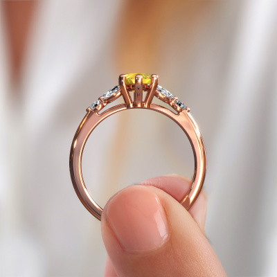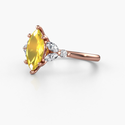 The ring shown above is called the Megan MRQ. We call this type of ring a pavé solitaire ring because it has one centre gemstone and a band that is also pave set with gemstones. This engagement ring is made in 14 Carat rose gold set with a 11x5.5 mm marquise yellow sapphire, and pave set lab-grown diamonds at the sides. Each piece of jewellery is made with passion and love by one of our master goldsmiths.This fantasy rose gold pavé solitaire engagement ring has an exquisite marquise yellow sapphire centre stone. To further accentuate the centre stone, the band is set full with more lab-grown diamonds. Its open prong setting allows light to strike the yellow sapphire from various angles and this adds sparkle to your yellow sapphire ring. The photo shown above depicts the goldsmith's carefully handcrafted details of the ring. The high positioning of the centre stone is truly eye-catching. The perfect engagement ring for the crown jewel of your life![bestp1v_long]Have you found a specific engagement ring somewhere which you would like to give to your loved one? Please feel free to express your wishes to our jewel designers because we would be honoured to turn your design into a fantasy engagement ring. You can follow the development of your ring design because we use 3D drawings. This gives you a realistic preview of how your design will look. You can also preorder a dummy. A dummy is a plastic ring, which can be shaped according your ring design. You can try it on and check if its width and size are suitable for you. We will gladly send you a non-binding offer, based on a fair price/ quality ratio. It will amaze you, considering the quality of the ring and gemstones.To make it easier for you, we offer a 30 day return policy. Check our terms and conditions.