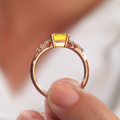 This 14 Carat rose gold ring is called Royce EME and is set with 8x6 mm yellow sapphire. What is it that makes your relationship unique? What is it about her that makes you want to bend down on one knee? The unique bond between the two of you is